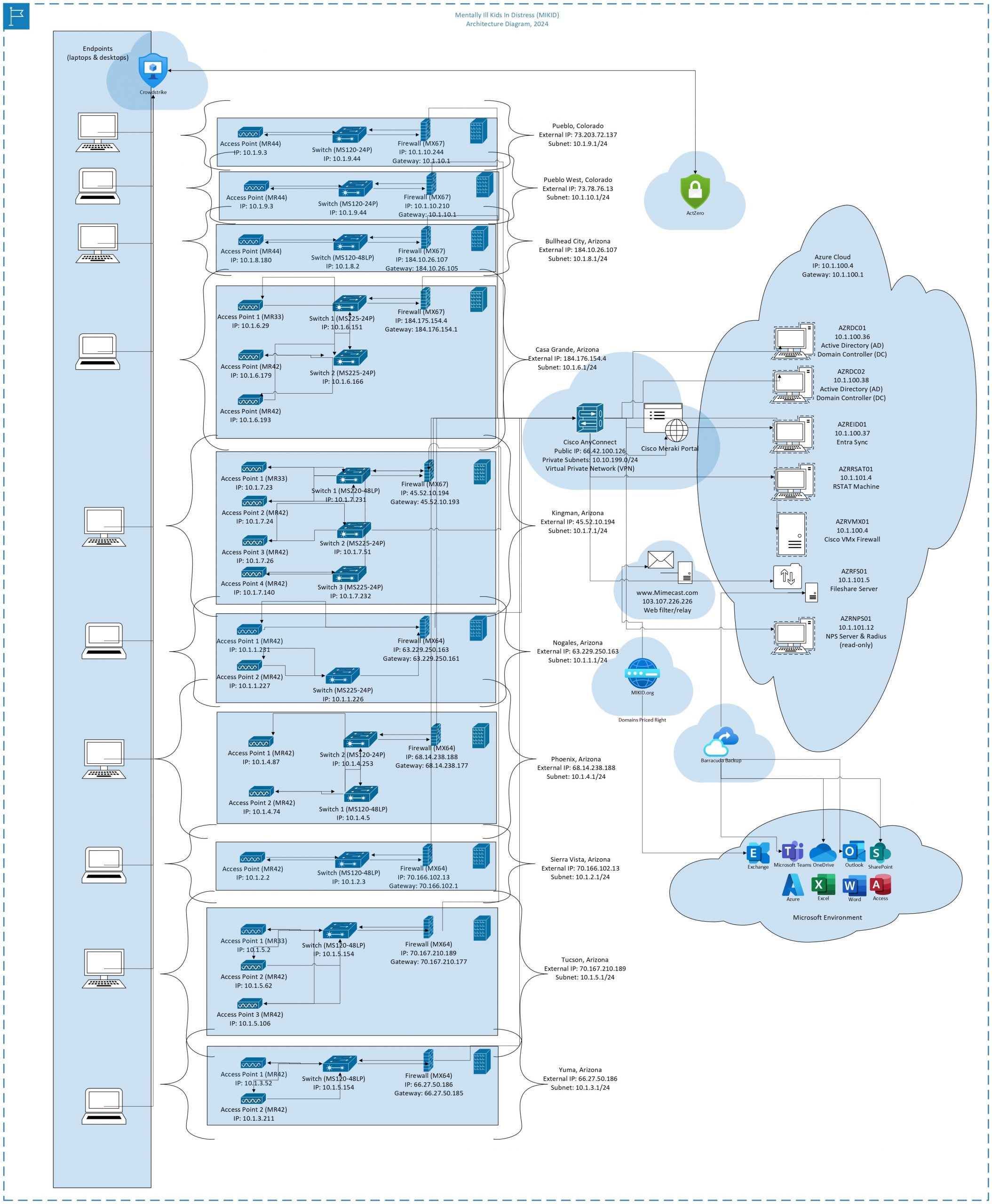 - Decentralized & Isolated Networks: Various sites (e.g., Pueblo, Sierra Vista, and Bullhead City) were suffering from network segmentation issues, preventing seamless communication between locations.